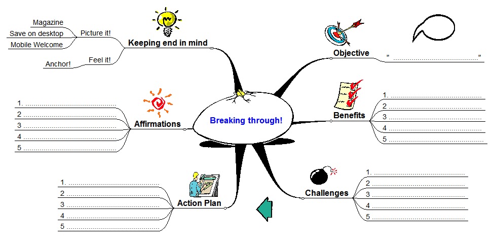 Going through the old maps I came across one I had saved as Breaking through! I think it is still useful for considering goals and objectives and so I post it here for readers to judge for themselves. As you can see write-in spaces are provided to help the user focus on aspects of achieving an objective.